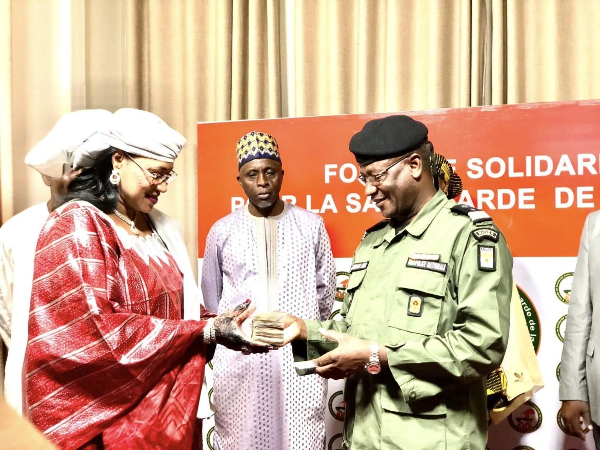La réception de la contribution des agents de la Nigérienne des Eaux (NDE) d’un montant de 5 150 000 Fcfa par la présidente du Fonds de Solidarité Pour la Sauvegarde de la Patrie Mme Brah Réki Moussa Hassane des mains du Directeur Général de la Nigérienne des Eaux Monsieur Aboubacar ABDOU, accompagné par le Directeur Général Adjoint de la Nigérienne des Eaux Monsieur LAMINOU Mahaman Manzo.