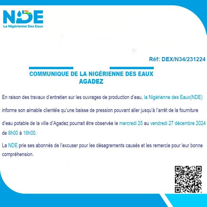 communiqué Nigérienne des Eaux – Agadez Par : Webmaster 2 janvier 2025 écrit par : Webmaster 2 janvier 2025 0 Commentaire 332 Vues Partager 1 FacebookLinkedinWhatsappTelegramEmail message précédent La réception de la contribution des agents de la Nigérienne des Eaux (NDE) d’un montant de 5 150 000 Fcfa par la présidente du Fonds de Solidarité Pour la Sauvegarde de la Patrie prochain article Approvisionnement en eau potable : la Nigérienne des Eaux (NDE) et la SPEN rassurent la population de Niamey sur le retour progressif à la normale Articles similaires Nigérienne des Eaux – Niamey 2 janvier 2025 Nigérienne des Eaux – Niamey 2 janvier 2025 Laisser un commentaire Annuler la réponse Enregistrez mon nom, mon adresse e-mail et mon site web dans ce navigateur pour mon prochain commentaire. Δ