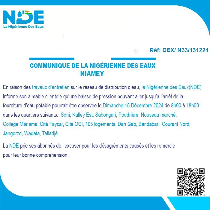 communiqué Nigérienne des Eaux – Niamey Par : Webmaster 2 janvier 2025 écrit par : Webmaster 2 janvier 2025 0 Commentaire 316 Vues Partager 0 FacebookLinkedinWhatsappTelegramEmail message précédent L’ouverture de la 45eme édition du Sabre National Dosso 2024, la Nigérienne des Eaux à l’honneur. prochain article La réception de la contribution des agents de la Nigérienne des Eaux (NDE) d’un montant de 5 150 000 Fcfa par la présidente du Fonds de Solidarité Pour la Sauvegarde de la Patrie Articles similaires Nigérienne des Eaux – Agadez 2 janvier 2025 Nigérienne des Eaux – Niamey 2 janvier 2025 Laisser un commentaire Annuler la réponse Enregistrez mon nom, mon adresse e-mail et mon site web dans ce navigateur pour mon prochain commentaire. Δ